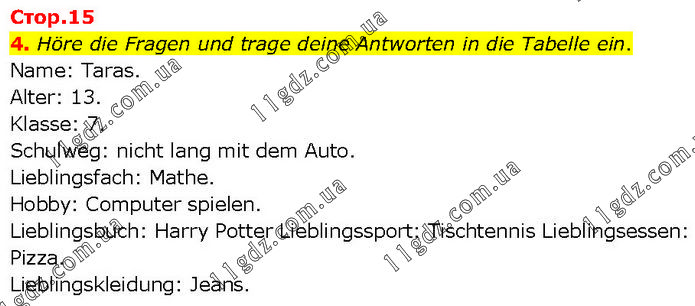 Höre die Fragen und trage deine Antworten in die Tabelle ein. Name: Taras. Alter: 13. Klasse: 7. Schulweg: nicht lang mit dem Auto. Lieblingsfach: Mathe. Hobby: Computer spielen. Lieblingsbuch: Harry Potter Lieblingssport: Tischtennis Lieblingsessen: Pizza. Lieblingskleidung: Jeans.