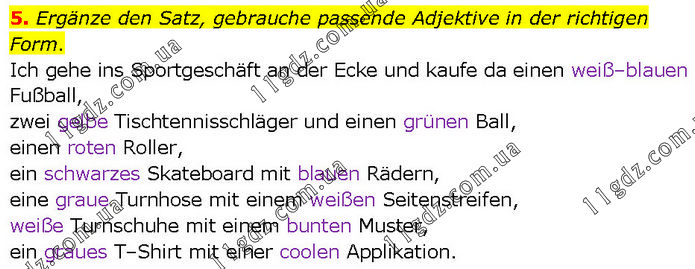 Ergänze den Satz, gebrauche passende Adjektive in der richtigen Form. Ich gehe ins Sportgeschäft an der Ecke und kaufe da einen weiß–blauen Fußball, zwei gelbe Tischtennisschläger und einen grünen Ball, einen roten Roller, ein schwarzes Skateboard mit blauen Rädern, eine graue Turnhose mit einem weißen Seitenstreifen, weiße Turnschuhe mit einem bunten Muster, ein graues T–Shirt mit einer coolen Applikation.