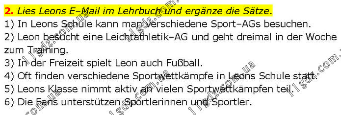 Lies Leons E–Mail im Lehrbuch und ergänze die Sätze. 1) In Leons Schule kann man verschiedene Sport–AGs besuchen. 2) Leon besucht eine Leichtathletik–AG und geht dreimal in der Woche zum Training. 3) In der Freizeit spielt Leon auch Fußball. 4) Oft finden verschiedene Sportwettkämpfe in Leons Schule statt. 5) Leons Klasse nimmt aktiv an vielen Sportwettkämpfen teil. 6) Die Fans unterstützen Sportlerinnen und Sportler.