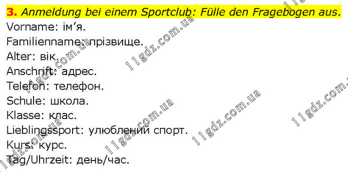 Anmeldung bei einem Sportclub: Fülle den Fragebogen aus. Vorname: ім’я. Familienname: прізвище. Alter: вік. Anschrift: адрес. Telefon: телефон. Schule: школа. Klasse: клас. Lieblingssport: улюблений спорт. Kurs: курс. Tag/Uhrzeit: день/час.