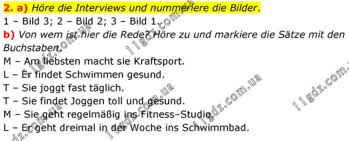 2. a) Höre die Interviews und nummeriere die Bilder. 1 – Bild 3; 2 – Bild 2; 3 – Bild 1. b) Von wem ist hier die Rede? Höre zu und markiere die Sätze mit den Buchstaben. M – Am liebsten macht sie Kraftsport. L – Er findet Schwimmen gesund. T – Sie joggt fast täglich. T – Sie findet Joggen toll und gesund. M – Sie geht regelmäßig ins Fitness–Studio. L – Er geht dreimal in der Woche ins Schwimmbad.