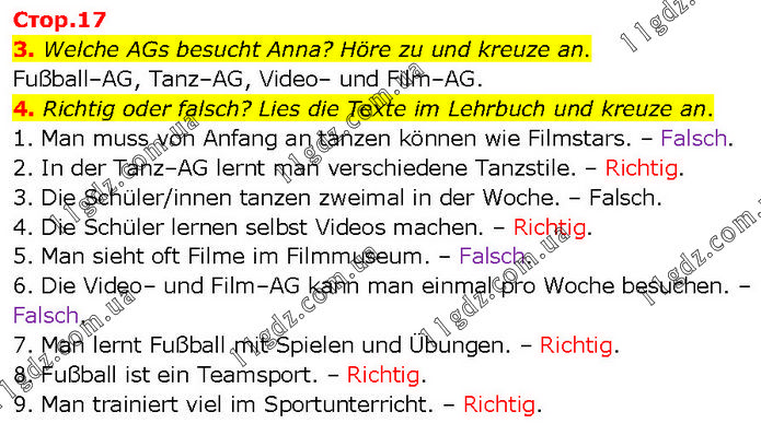 3. Welche AGs besucht Anna? Höre zu und kreuze an. Fußball–AG, Tanz–AG, Video– und Film–AG. 4. Richtig oder falsch? Lies die Texte im Lehrbuch und kreuze an. 1. Man muss von Anfang an tanzen können wie Filmstars. – Falsch. 2. In der Tanz–AG lernt man verschiedene Tanzstile. – Richtig. 3. Die Schüler/innen tanzen zweimal in der Woche. – Falsch. 4. Die Schüler lernen selbst Videos machen. – Richtig. 5. Man sieht oft Filme im Filmmuseum. – Falsch. 6. Die Video– und Film–AG kann man einmal pro Woche besuchen. – Falsch. 7. Man lernt Fußball mit Spielen und Übungen. – Richtig. 8. Fußball ist ein Teamsport. – Richtig. 9. Man trainiert viel im Sportunterricht. – Richtig.