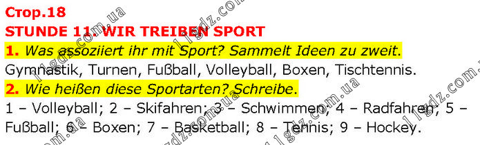 STUNDE 11. WIR TREIBEN SPORT 1. Was assoziiert ihr mit Sport? Sammelt Ideen zu zweit. Gymnastik, Turnen, Fußball, Volleyball, Boxen, Tischtennis. 2. Wie heißen diese Sportarten? Schreibe. 1 – Volleyball; 2 – Skifahren; 3 – Schwimmen; 4 – Radfahren; 5 – Fußball; 6 – Boxen; 7 – Basketball; 8 – Tennis; 9 – Hockey.