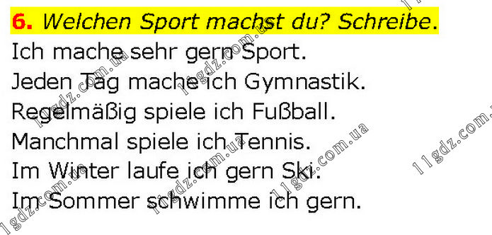 Welchen Sport machst du? Schreibe. Ich mache sehr gern Sport. Jeden Tag mache ich Gymnastik. Regelmäßig spiele ich Fußball. Manchmal spiele ich Tennis. Im Winter laufe ich gern Ski. Im Sommer schwimme ich gern.