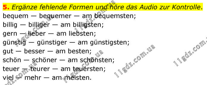 5. Ergänze fehlende Formen und höre das Audio zur Kontrolle. bequem — bequemer — am bequemsten; billig — billiger — am billigsten; gern — lieber — am liebsten; günstig — günstiger — am günstigsten; gut — besser — am besten; schön — schöner — am schönsten; teuer — teurer — am teuersten; viel — mehr — am meisten.