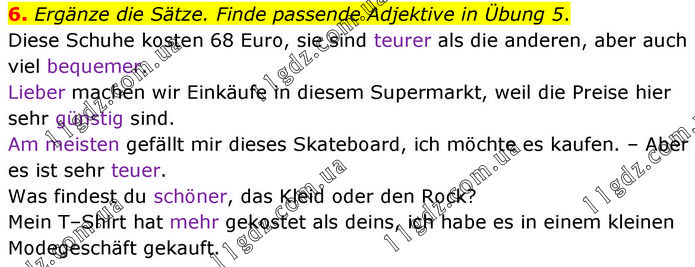 6. Ergänze die Sätze. Finde passende Adjektive in Übung 5. Diese Schuhe kosten 68 Euro, sie sind teurer als die anderen, aber auch viel bequemer. Lieber machen wir Einkäufe in diesem Supermarkt, weil die Preise hier sehr günstig sind. Am meisten gefällt mir dieses Skateboard, ich möchte es kaufen. – Aber es ist sehr teuer. Was findest du schöner, das Kleid oder den Rock? Mein T–Shirt hat mehr gekostet als deins, ich habe es in einem kleinen Modegeschäft gekauft.