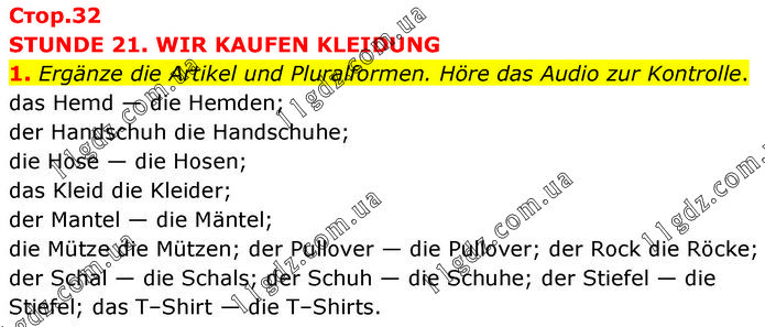 STUNDE 21. WIR KAUFEN KLEIDUNG 1. Ergänze die Artikel und Pluralformen. Höre das Audio zur Kontrolle. das Hemd — die Hemden; der Handschuh die Handschuhe; die Hose — die Hosen; das Kleid die Kleider; der Mantel — die Mäntel; die Mütze die Mützen; der Pullover — die Pullover; der Rock die Röcke; der Schal — die Schals; der Schuh — die Schuhe; der Stiefel — die Stiefel; das T–Shirt — die T–Shirts.