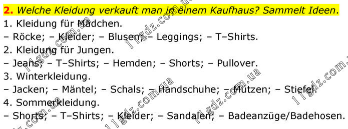 2. Welche Kleidung verkauft man in einem Kaufhaus? Sammelt Ideen. 1. Kleidung für Mädchen. – Röcke; – Kleider; – Blusen; – Leggings; – T–Shirts. 2. Kleidung für Jungen. – Jeans; – T–Shirts; – Hemden; – Shorts; – Pullover. 3. Winterkleidung. – Jacken; – Mäntel; – Schals; – Handschuhe; – Mützen; – Stiefel. 4. Sommerkleidung. – Shorts; – T–Shirts; – Kleider; – Sandalen; – Badeanzüge/Badehosen.