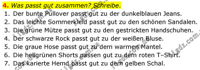 4. Was passt gut zusammen? Schreibe. 1. Der bunte Pullover passt gut zu der dunkelblauen Jeans. 2. Das leichte Sommerkleid passt gut zu den schönen Sandalen. 3. Die grüne Mütze passt gut zu den gestrickten Handschuhen. 4. Der schwarze Rock passt gut zu der weißen Bluse. 5. Die graue Hose passt gut zu dem warmen Mantel. 6. Die hellgrünen Shorts passen gut zu dem roten T–Shirt. 7. Das karierte Hemd passt gut zu dem gelben Schal.