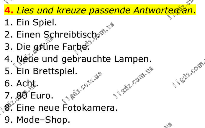 4. Lies und kreuze passende Antworten an. 1. Ein Spiel. 2. Einen Schreibtisch. 3. Die grüne Farbe. 4. Neue und gebrauchte Lampen. 5. Ein Brettspiel. 6. Acht. 7. 80 Euro. 8. Eine neue Fotokamera. 9. Mode–Shop.