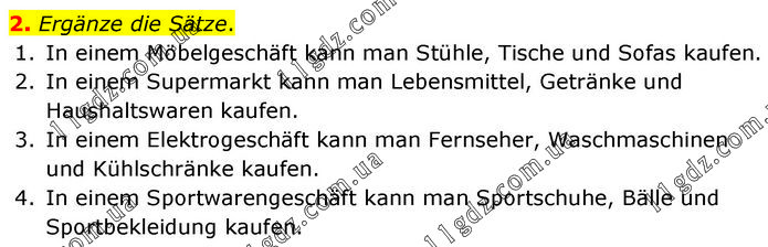 2. Ergänze die Sätze. 1. In einem Möbelgeschäft kann man Stühle, Tische und Sofas kaufen. 2. In einem Supermarkt kann man Lebensmittel, Getränke und Haushaltswaren kaufen. 3. In einem Elektrogeschäft kann man Fernseher, Waschmaschinen und Kühlschränke kaufen. 4. In einem Sportwarengeschäft kann man Sportschuhe, Bälle und Sportbekleidung kaufen.