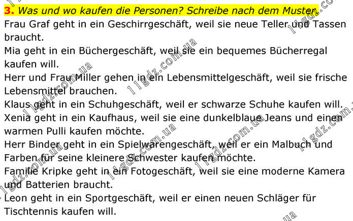 3. Was und wo kaufen die Personen? Schreibe nach dem Muster. Frau Graf geht in ein Geschirrgeschäft, weil sie neue Teller und Tassen braucht. Mia geht in ein Büchergeschäft, weil sie ein bequemes Bücherregal kaufen will. Herr und Frau Miller gehen in ein Lebensmittelgeschäft, weil sie frische Lebensmittel brauchen. Klaus geht in ein Schuhgeschäft, weil er schwarze Schuhe kaufen will. Xenia geht in ein Kaufhaus, weil sie eine dunkelblaue Jeans und einen warmen Pulli kaufen möchte. Herr Binder geht in ein Spielwarengeschäft, weil er ein Malbuch und Farben für seine kleinere Schwester kaufen möchte. Familie Kripke geht in ein Fotogeschäft, weil sie eine moderne Kamera und Batterien braucht. Leon geht in ein Sportgeschäft, weil er einen neuen Schläger für Tischtennis kaufen will.