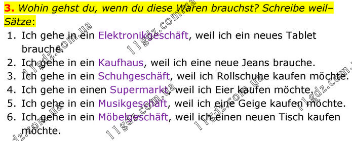 3. Wohin gehst du, wenn du diese Waren brauchst? Schreibe weil–Sätze: 1. Ich gehe in ein Elektronikgeschäft, weil ich ein neues Tablet brauche. 2. Ich gehe in ein Kaufhaus, weil ich eine neue Jeans brauche. 3. Ich gehe in ein Schuhgeschäft, weil ich Rollschuhe kaufen möchte. 4. Ich gehe in einen Supermarkt, weil ich Eier kaufen möchte. 5. Ich gehe in ein Musikgeschäft, weil ich eine Geige kaufen möchte. 6. Ich gehe in ein Möbelgeschäft, weil ich einen neuen Tisch kaufen möchte.