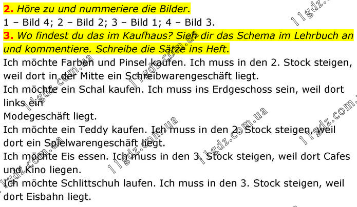 2. Höre zu und nummeriere die Bilder. 1 – Bild 4; 2 – Bild 2; 3 – Bild 1; 4 – Bild 3. 3. Wo findest du das im Kaufhaus? Sieh dir das Schema im Lehrbuch an und kommentiere. Schreibe die Sätze ins Heft. Ich möchte Farben und Pinsel kaufen. Ich muss in den 2. Stock steigen, weil dort in der Mitte ein Schreibwarengeschäft liegt. Ich möchte ein Schal kaufen. Ich muss ins Erdgeschoss sein, weil dort links ein Modegeschäft liegt. Ich möchte ein Teddy kaufen. Ich muss in den 2. Stock steigen, weil dort ein Spielwarengeschäft liegt. Ich möchte Eis essen. Ich muss in den 3. Stock steigen, weil dort Cafes und Kino liegen. Ich möchte Schlittschuh laufen. Ich muss in den 3. Stock steigen, weil dort Eisbahn liegt.