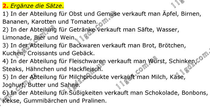 2. Ergänze die Sätze. 1) In der Abteilung für Obst und Gemüse verkauft man Äpfel, Birnen, Bananen, Karotten und Tomaten. 2) In der Abteilung für Getränke verkauft man Säfte, Wasser, Limonade, Bier und Wein. 3) In der Abteilung für Backwaren verkauft man Brot, Brötchen, Kuchen, Croissants und Gebäck. 4) In der Abteilung für Fleischwaren verkauft man Wurst, Schinken, Steaks, Hähnchen und Hackfleisch. 5) In der Abteilung für Milchprodukte verkauft man Milch, Käse, Joghurt, Butter und Sahne. 6) In der Abteilung für Süßigkeiten verkauft man Schokolade, Bonbons, Kekse, Gummibärchen und Pralinen.