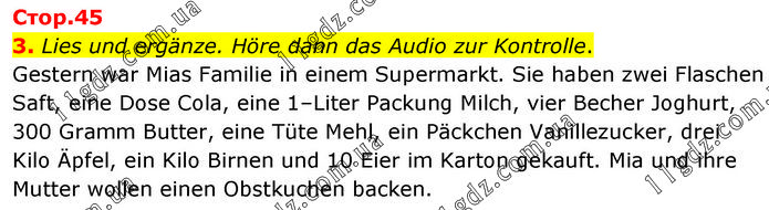 3. Lies und ergänze. Höre dann das Audio zur Kontrolle. Gestern war Mias Familie in einem Supermarkt. Sie haben zwei Flaschen Saft, eine Dose Cola, eine 1–Liter Packung Milch, vier Becher Joghurt, 300 Gramm Butter, eine Tüte Mehl, ein Päckchen Vanillezucker, drei Kilo Äpfel, ein Kilo Birnen und 10 Eier im Karton gekauft. Mia und ihre Mutter wollen einen Obstkuchen backen.