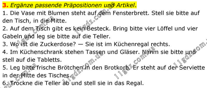 3. Ergänze passende Präpositionen und Artikel. 1. Die Vase mit Blumen steht auf dem Fensterbrett. Stell sie bitte auf den Tisch, in die Mitte. 2. Auf dem Tisch gibt es kein Besteck. Bring bitte vier Löffel und vier Gabeln und leg sie bitte auf die Teller. 3. Wo ist die Zuckerdose? — Sie ist im Küchenregal rechts. 4. Im Küchenschrank stehen Tassen und Gläser. Nimm sie bitte und stell auf die Tabletts. 5. Leg bitte frische Brötchen in den Brotkorb. Er steht auf der Serviette in der Mitte des Tisches. 6. Trockne die Teller ab und stell sie in das Regal.