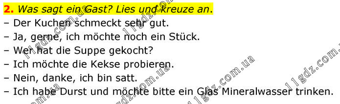 2. Was sagt ein Gast? Lies und kreuze an. – Der Kuchen schmeckt sehr gut. – Ja, gerne, ich möchte noch ein Stück. – Wer hat die Suppe gekocht? – Ich möchte die Kekse probieren. – Nein, danke, ich bin satt. – Ich habe Durst und möchte bitte ein Glas Mineralwasser trinken.
