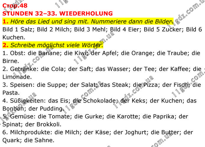 STUNDEN 32–33. WIEDERHOLUNG 1. Höre das Lied und sing mit. Nummeriere dann die Bilder. Bild 1 Salz; Bild 2 Milch; Bild 3 Mehl; Bild 4 Eier; Bild 5 Zucker; Bild 6 Kuchen. 2. Schreibe möglichst viele Wörter. 1. Obst: die Banane; die Kiwi; der Apfel; die Orange; die Traube; die Birne. 2. Getränke: die Cola; der Saft; das Wasser; der Tee; der Kaffee; die Limonade. 3. Speisen: die Suppe; der Salat; das Steak; die Pizza; der Fisch; die Pasta. 4. Süßigkeiten: das Eis; die Schokolade; der Keks; der Kuchen; das Bonbon; der Pudding. 5. Gemüse: die Tomate; die Gurke; die Karotte; die Paprika; der Spinat; der Brokkoli. 6. Milchprodukte: die Milch; der Käse; der Joghurt; die Butter; der Quark; die Sahne.