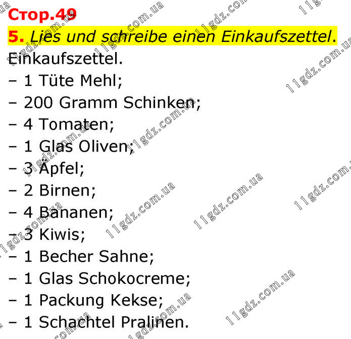 5. Lies und schreibe einen Einkaufszettel. Einkaufszettel. – 1 Tüte Mehl; – 200 Gramm Schinken; – 4 Tomaten; – 1 Glas Oliven; – 3 Äpfel; – 2 Birnen; – 4 Bananen; – 3 Kiwis; – 1 Becher Sahne; – 1 Glas Schokocreme; – 1 Packung Kekse; – 1 Schachtel Pralinen.
