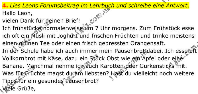 4. Lies Leons Forumsbeitrag im Lehrbuch und schreibe eine Antwort. Hallo Leon, vielen Dank für deinen Brief! Ich frühstücke normalerweise um 7 Uhr morgens. Zum Frühstück esse ich oft ein Müsli mit Joghurt und frischen Früchten und trinke meistens einen grünen Tee oder einen frisch gepressten Orangensaft. In der Schule habe ich auch immer mein Pausenbrot dabei. Ich esse oft Vollkornbrot mit Käse, dazu ein Stück Obst wie ein Apfel oder eine Banane. Manchmal nehme ich auch Karotten oder Gurkensticks mit. Was für Früchte magst du am liebsten? Hast du vielleicht noch weitere Tipps für ein gesundes Pausenbrot? Viele Grüße,