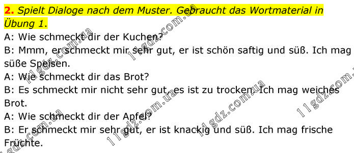 2. Spielt Dialoge nach dem Muster. Gebraucht das Wortmaterial in Übung 1. A: Wie schmeckt dir der Kuchen? B: Mmm, er schmeckt mir sehr gut, er ist schön saftig und süß. Ich mag süße Speisen. A: Wie schmeckt dir das Brot? B: Es schmeckt mir nicht sehr gut, es ist zu trocken. Ich mag weiches Brot. A: Wie schmeckt dir der Apfel? B: Er schmeckt mir sehr gut, er ist knackig und süß. Ich mag frische Früchte.