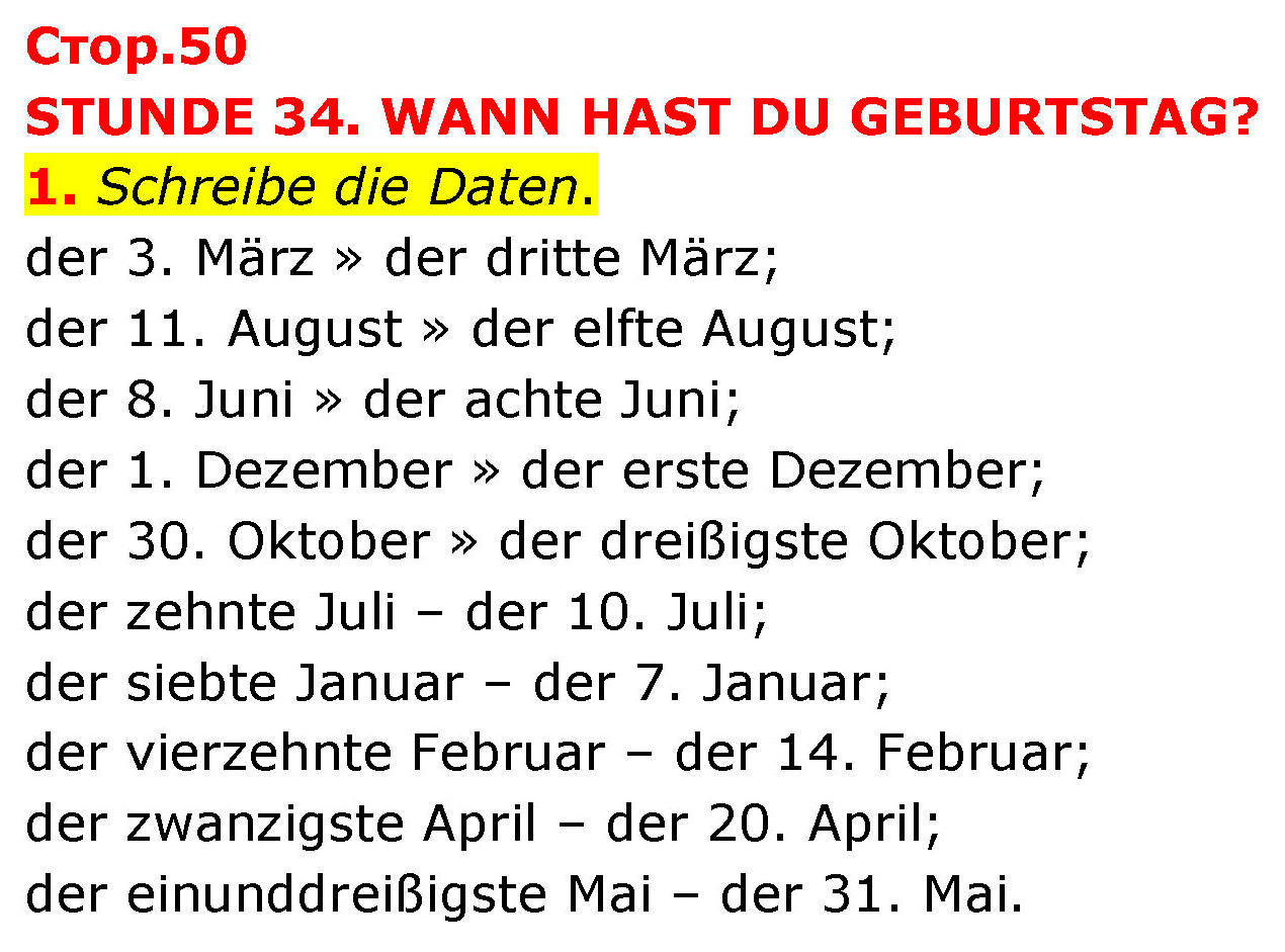 Schreibe die Daten. der 3. März » der dritte März; der 11. August » der elfte August; der 8. Juni » der achte Juni; der 1. Dezember » der erste Dezember; der 30. Oktober » der dreißigste Oktober; der zehnte Juli – der 10. Juli; der siebte Januar – der 7. Januar; der vierzehnte Februar – der 14. Februar; der zwanzigste April – der 20. April; der einunddreißigste Mai – der 31. Mai.