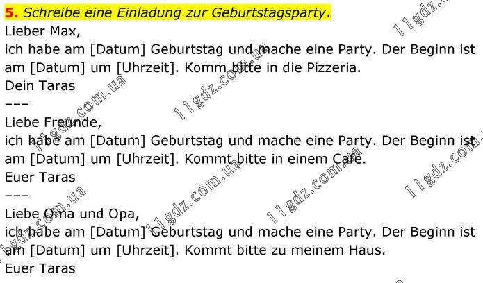 Schreibe eine Einladung zur Geburtstagsparty. Lieber Max, ich habe am [Datum] Geburtstag und mache eine Party. Der Beginn ist am [Datum] um [Uhrzeit]. Komm bitte in die Pizzeria. Dein Taras ––– Liebe Freunde, ich habe am [Datum] Geburtstag und mache eine Party. Der Beginn ist am [Datum] um [Uhrzeit]. Kommt bitte in einem Café. Euer Taras ––– Liebe Oma und Opa, ich habe am [Datum] Geburtstag und mache eine Party. Der Beginn ist am [Datum] um [Uhrzeit]. Kommt bitte zu meinem Haus. Euer Taras