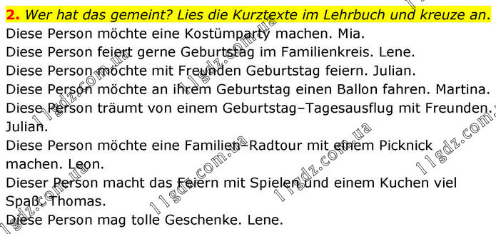 Wer hat das gemeint? Lies die Kurztexte im Lehrbuch und kreuze an. Diese Person möchte eine Kostümparty machen. Mia. Diese Person feiert gerne Geburtstag im Familienkreis. Lene. Diese Person möchte mit Freunden Geburtstag feiern. Julian. Diese Person möchte an ihrem Geburtstag einen Ballon fahren. Martina. Diese Person träumt von einem Geburtstag–Tagesausflug mit Freunden. Julian. Diese Person möchte eine Familien–Radtour mit einem Picknick machen. Leon. Dieser Person macht das Feiern mit Spielen und einem Kuchen viel Spaß. Thomas. Diese Person mag tolle Geschenke. Lene.