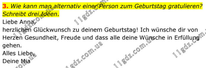 Wie kann man alternativ einer Person zum Geburtstag gratulieren? Schreibt drei Ideen. Liebe Anna, herzlichen Glückwunsch zu deinem Geburtstag! Ich wünsche dir von Herzen Gesundheit, Freude und dass alle deine Wünsche in Erfüllung gehen. Alles Liebe, Deine Mia