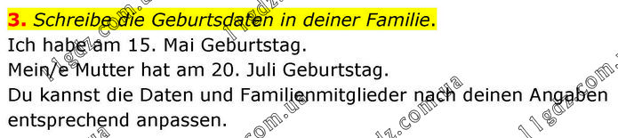 Schreibe die Geburtsdaten in deiner Familie. Ich habe am 15. Mai Geburtstag. Mein/e Mutter hat am 20. Juli Geburtstag. Du kannst die Daten und Familienmitglieder nach deinen Angaben entsprechend anpassen.