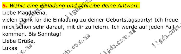 Wähle eine Einladung und schreibe deine Antwort: Liebe Magdalena, vielen Dank für die Einladung zu deiner Geburtstagsparty! Ich freue mich schon sehr darauf, mit dir zu feiern. Ich werde auf jeden Fall kommen. Bis Sonntag! Liebe Grüße, Lukas