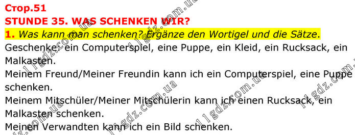 Was kann man schenken? Ergänze den Wortigel und die Sätze. Geschenke: ein Computerspiel, eine Puppe, ein Kleid, ein Rucksack, ein Malkasten. Meinem Freund/Meiner Freundin kann ich ein Computerspiel, eine Puppe schenken. Meinem Mitschüler/Meiner Mitschülerin kann ich einen Rucksack, ein Malkasten schenken. Meinen Verwandten kann ich ein Bild schenken.