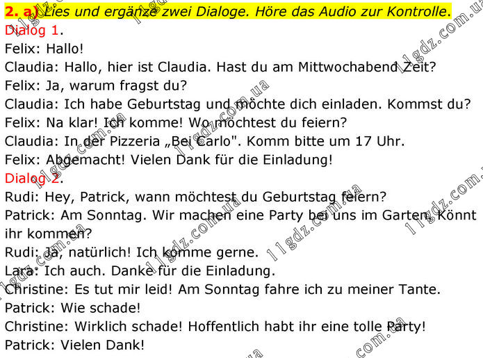 a) Lies und ergänze zwei Dialoge. Höre das Audio zur Kontrolle. Dialog 1. Felix: Hallo! Claudia: Hallo, hier ist Claudia. Hast du am Mittwochabend Zeit? Felix: Ja, warum fragst du? Claudia: Ich habe Geburtstag und möchte dich einladen. Kommst du? Felix: Na klar! Ich komme! Wo möchtest du feiern? Claudia: In der Pizzeria „Bei Carlo". Komm bitte um 17 Uhr. Felix: Abgemacht! Vielen Dank für die Einladung! Dialog 2. Rudi: Hey, Patrick, wann möchtest du Geburtstag feiern? Patrick: Am Sonntag. Wir machen eine Party bei uns im Garten. Könnt ihr kommen? Rudi: Ja, natürlich! Ich komme gerne. Lara: Ich auch. Danke für die Einladung. Christine: Es tut mir leid! Am Sonntag fahre ich zu meiner Tante. Patrick: Wie schade! Christine: Wirklich schade! Hoffentlich habt ihr eine tolle Party! Patrick: Vielen Dank!