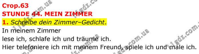 STUNDE 44. MEIN ZIMMER 1. Schreibe dein Zimmer–Gedicht. In meinem Zimmer lese ich, schlafe ich und träume ich. Hier telefoniere ich mit meinem Freund, spiele ich und male ich.
