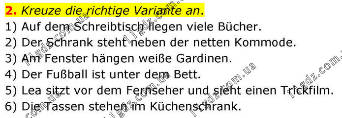 Kreuze die richtige Variante an. 1) Auf dem Schreibtisch liegen viele Bücher. 2) Der Schrank steht neben der netten Kommode. 3) Am Fenster hängen weiße Gardinen. 4) Der Fußball ist unter dem Bett. 5) Lea sitzt vor dem Fernseher und sieht einen Trickfilm. 6) Die Tassen stehen im Küchenschrank.