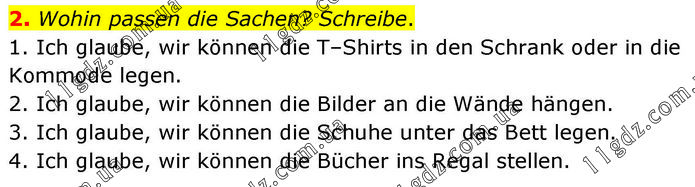 Wohin passen die Sachen? Schreibe. 1. Ich glaube, wir können die T–Shirts in den Schrank oder in die Kommode legen. 2. Ich glaube, wir können die Bilder an die Wände hängen. 3. Ich glaube, wir können die Schuhe unter das Bett legen. 4. Ich glaube, wir können die Bücher ins Regal stellen.