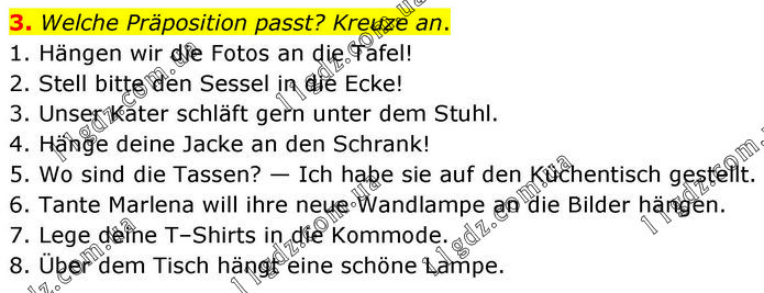 Welche Präposition passt? Kreuze an. 1. Hängen wir die Fotos an die Tafel! 2. Stell bitte den Sessel in die Ecke! 3. Unser Kater schläft gern unter dem Stuhl. 4. Hänge deine Jacke an den Schrank! 5. Wo sind die Tassen? — Ich habe sie auf den Küchentisch gestellt. 6. Tante Marlena will ihre neue Wandlampe an die Bilder hängen. 7. Lege deine T–Shirts in die Kommode. 8. Über dem Tisch hängt eine schöne Lampe.
