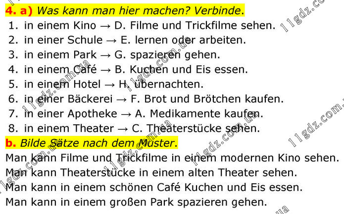 a) Was kann man hier machen? Verbinde. 1. in einem Kino → D. Filme und Trickfilme sehen. 2. in einer Schule → E. lernen oder arbeiten. 3. in einem Park → G. spazieren gehen. 4. in einem Café → B. Kuchen und Eis essen. 5. in einem Hotel → H. übernachten. 6. in einer Bäckerei → F. Brot und Brötchen kaufen. 7. in einer Apotheke → A. Medikamente kaufen. 8. in einem Theater → C. Theaterstücke sehen. b. Bilde Sätze nach dem Muster. Man kann Filme und Trickfilme in einem modernen Kino sehen. Man kann Theaterstücke in einem alten Theater sehen. Man kann in einem schönen Café Kuchen und Eis essen. Man kann in einem großen Park spazieren gehen.