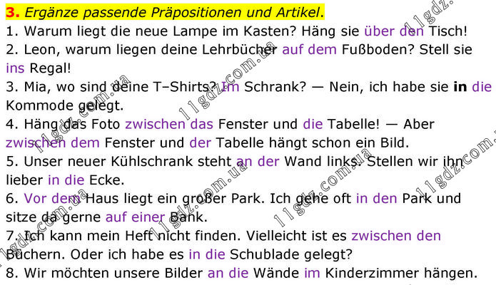 Ergänze passende Präpositionen und Artikel. 1. Warum liegt die neue Lampe im Kasten? Häng sie über den Tisch! 2. Leon, warum liegen deine Lehrbücher auf dem Fußboden? Stell sie ins Regal! 3. Mia, wo sind deine T–Shirts? Im Schrank? — Nein, ich habe sie in die Kommode gelegt. 4. Häng das Foto zwischen das Fenster und die Tabelle! — Aber zwischen dem Fenster und der Tabelle hängt schon ein Bild. 5. Unser neuer Kühlschrank steht an der Wand links. Stellen wir ihn lieber in die Ecke. 6. Vor dem Haus liegt ein großer Park. Ich gehe oft in den Park und sitze da gerne auf einer Bank. 7. Ich kann mein Heft nicht finden. Vielleicht ist es zwischen den Büchern. Oder ich habe es in die Schublade gelegt? 8. Wir möchten unsere Bilder an die Wände im Kinderzimmer hängen.