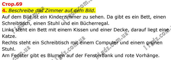 Beschreibe das Zimmer auf dem Bild. Auf dem Bild ist ein Kinderzimmer zu sehen. Da gibt es ein Bett, einen Schreibtisch, einen Stuhl und ein Bücherregal. Links steht ein Bett mit einem Kissen und einer Decke, darauf liegt eine Katze. Rechts steht ein Schreibtisch mit einem Computer und einem grünen Stuhl. Am Fenster gibt es Blumen auf der Fensterbank und rote Vorhänge.