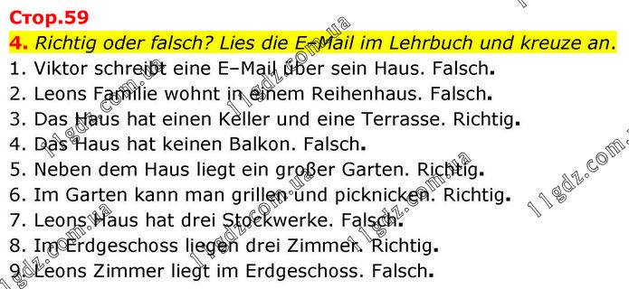 Richtig oder falsch? Lies die E–Mail im Lehrbuch und kreuze an. 1. Viktor schreibt eine E–Mail über sein Haus. Falsch. 2. Leons Familie wohnt in einem Reihenhaus. Falsch. 3. Das Haus hat einen Keller und eine Terrasse. Richtig. 4. Das Haus hat keinen Balkon. Falsch. 5. Neben dem Haus liegt ein großer Garten. Richtig. 6. Im Garten kann man grillen und picknicken. Richtig. 7. Leons Haus hat drei Stockwerke. Falsch. 8. Im Erdgeschoss liegen drei Zimmer. Richtig. 9. Leons Zimmer liegt im Erdgeschoss. Falsch.