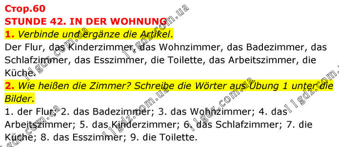 STUNDE 42. IN DER WOHNUNG 1. Verbinde und ergänze die Artikel. Der Flur, das Kinderzimmer, das Wohnzimmer, das Badezimmer, das Schlafzimmer, das Esszimmer, die Toilette, das Arbeitszimmer, die Küche. 2. Wie heißen die Zimmer? Schreibe die Wörter aus Übung 1 unter die Bilder. 1. der Flur; 2. das Badezimmer; 3. das Wohnzimmer; 4. das Arbeitszimmer; 5. das Kinderzimmer; 6. das Schlafzimmer; 7. die Küche; 8. das Esszimmer; 9. die Toilette.