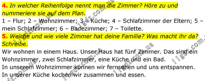 4. In welcher Reihenfolge nennt man die Zimmer? Höre zu und nummeriere sie auf dem Plan. 1 – Flur; 2 – Wohnzimmer; 3 – Küche; 4 – Schlafzimmer der Eltern; 5 – mein Schlafzimmer; 6 – Badezimmer; 7 – Toilette. 5. Welche und wie viele Zimmer hat deine Familie? Was macht ihr da? Schreibe. Wir wohnen in einem Haus. Unser Haus hat fünf Zimmer. Das sind ein Wohnzimmer, zwei Schlafzimmer, eine Küche und ein Bad. In unserem Wohnzimmer können wir fernsehen und uns entspannen. In unserer Küche kochen wir zusammen und essen.