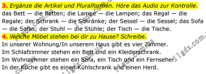 3. Ergänze die Artikel und Pluralformen. Höre das Audio zur Kontrolle. das Bett — die Betten; die Lampe — die Lampen; das Regal — die Regale; der Schrank — die Schränke; der Sessel — die Sessel; das Sofa — die Sofas; der Stuhl — die Stühle; der Tisch — die Tische. 4. Welche Möbel stehen bei dir zu Hause? Schreibe. In unserer Wohnung/In unserem Haus gibt es vier Zimmer. Im Schlafzimmer stehen ein Bett und ein Kleiderschrank. Im Wohnzimmer stehen ein Sofa, ein Tisch und ein Fernseher. In der Küche gibt es einen Kühlschrank und einen Herd.