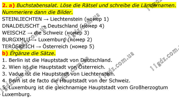 a) Buchstabensalat. Löse die Rätsel und schreibe die Ländernamen. Nummeriere dann die Bilder. STEINLIECHTEN → Liechtenstein (номер 1) DNALDEUSCHT → Deutschland (номер 4) WEISCHZ → die Schweiz (номер 3) BURGXMLU → Luxemburg (номер 2) TERÖSREICH → Österreich (номер 5) b) Ergänze die Sätze. 1. Berlin ist die Hauptstadt von Deutschland. 2. Wien ist die Hauptstadt von Österreich. 3. Vaduz ist die Hauptstadt von Liechtenstein. 4. Bern ist de facto die Hauptstadt von der Schweiz. 5. Luxemburg ist die gleichnamige Hauptstadt vom Großherzogtum Luxemburg.