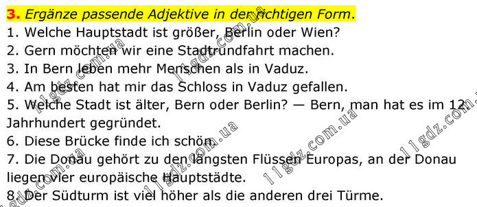 Ergänze passende Adjektive in der richtigen Form. 1. Welche Hauptstadt ist größer, Berlin oder Wien? 2. Gern möchten wir eine Stadtrundfahrt machen. 3. In Bern leben mehr Menschen als in Vaduz. 4. Am besten hat mir das Schloss in Vaduz gefallen. 5. Welche Stadt ist älter, Bern oder Berlin? — Bern, man hat es im 12. Jahrhundert gegründet. 6. Diese Brücke finde ich schön. 7. Die Donau gehört zu den längsten Flüssen Europas, an der Donau liegen vier europäische Hauptstädte. 8. Der Südturm ist viel höher als die anderen drei Türme.