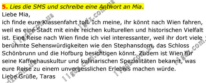 Lies die SMS und schreibe eine Antwort an Mia. Liebe Mia, ich finde eure Klassenfahrt toll. Ich meine, ihr könnt nach Wien fahren, weil es eine Stadt mit einer reichen kulturellen und historischen Vielfalt ist. Eine Reise nach Wien finde ich viel interessanter, weil ihr dort viele berühmte Sehenswürdigkeiten wie den Stephansdom, das Schloss Schönbrunn und die Hofburg besichtigen könnt. Zudem ist Wien für seine Kaffeehauskultur und kulinarischen Spezialitäten bekannt, was eure Reise zu einem unvergesslichen Erlebnis machen würde. Liebe Grüße, Taras