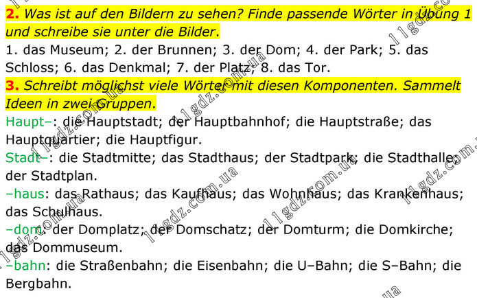 2. Was ist auf den Bildern zu sehen? Finde passende Wörter in Übung 1 und schreibe sie unter die Bilder. 1. das Museum; 2. der Brunnen; 3. der Dom; 4. der Park; 5. das Schloss; 6. das Denkmal; 7. der Platz; 8. das Tor. 3. Schreibt möglichst viele Wörter mit diesen Komponenten. Sammelt Ideen in zwei Gruppen. Haupt–: die Hauptstadt; der Hauptbahnhof; die Hauptstraße; das Hauptquartier; die Hauptfigur. Stadt–: die Stadtmitte; das Stadthaus; der Stadtpark; die Stadthalle; der Stadtplan. –haus: das Rathaus; das Kaufhaus; das Wohnhaus; das Krankenhaus; das Schulhaus. –dom: der Domplatz; der Domschatz; der Domturm; die Domkirche; das Dommuseum. –bahn: die Straßenbahn; die Eisenbahn; die U–Bahn; die S–Bahn; die Bergbahn.