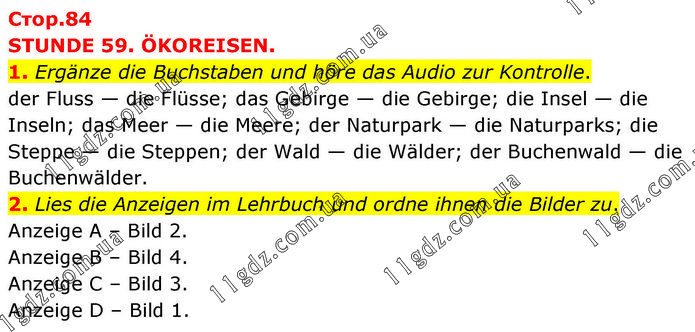 STUNDE 59. ÖKOREISEN. 1. Ergänze die Buchstaben und höre das Audio zur Kontrolle. der Fluss — die Flüsse; das Gebirge — die Gebirge; die Insel — die Inseln; das Meer — die Meere; der Naturpark — die Naturparks; die Steppe — die Steppen; der Wald — die Wälder; der Buchenwald — die Buchenwälder. 2. Lies die Anzeigen im Lehrbuch und ordne ihnen die Bilder zu. Anzeige A – Bild 2. Anzeige B – Bild 4. Anzeige C – Bild 3. Anzeige D – Bild 1.